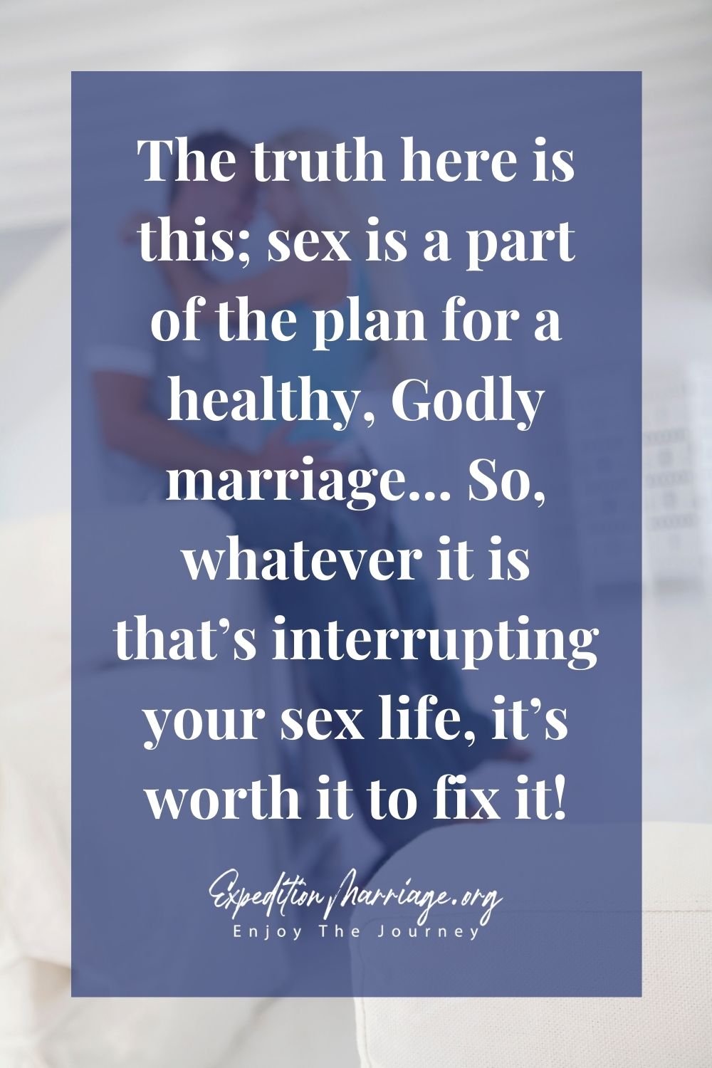 The truth here is this; sex is a part of the plan for a healthy, Godly marriage. God designed it for reproduction, pleasure, comfort, and connection. It is the physical manifestation of two becoming one. It should be both physically and emotionally fulfilling, beautiful, and connecting for BOTH of you. So, whatever it is that’s interrupting your sex life, it’s worth it to fix it. You deserve great sex in your marriage!